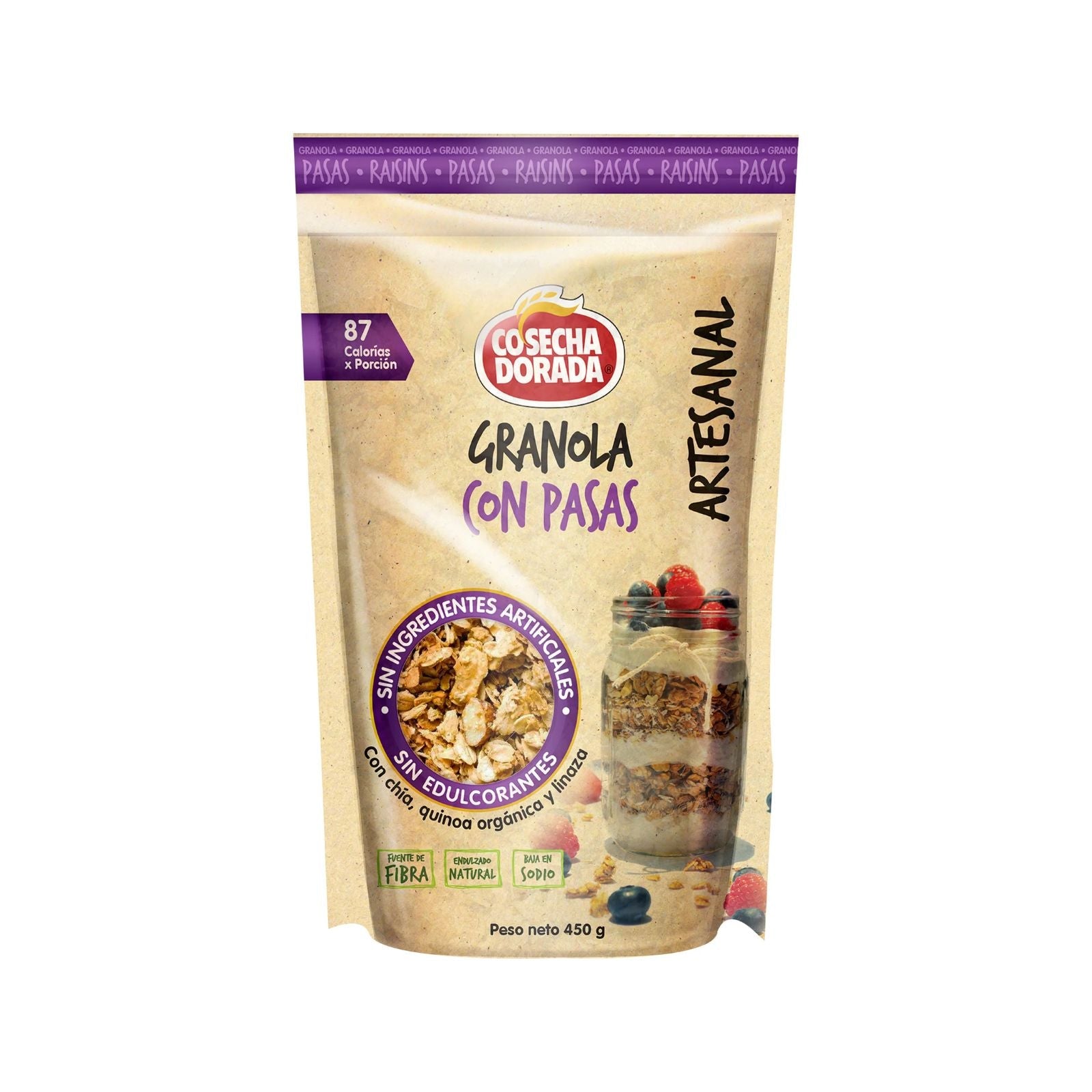 - GRANOLA ARTESANAL CON PASAS 450 GR COSECHA DORADA